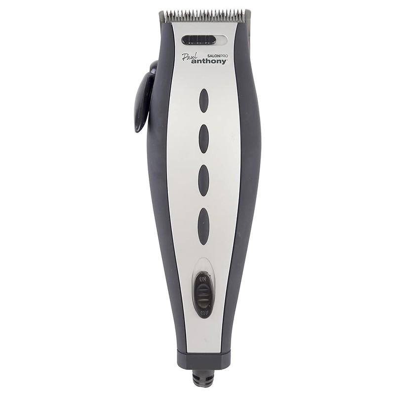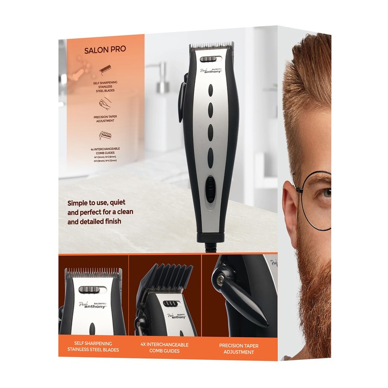 Paul Anthony Salon Pro Corded Hair Clipper - Lightweight - Self Sharpening Stainless Steel Blades - 4 Interchangeable Comb Guides - Precision Taper - Powerful Quiet Motor - Silver & Black - H5120BK