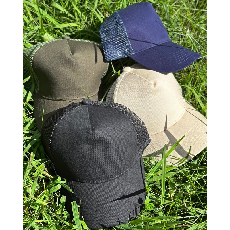 - Vintage-Inspired Trucker Hat – Classic mesh back trucker cap with a structured front and breathable mesh for all-day comfort.