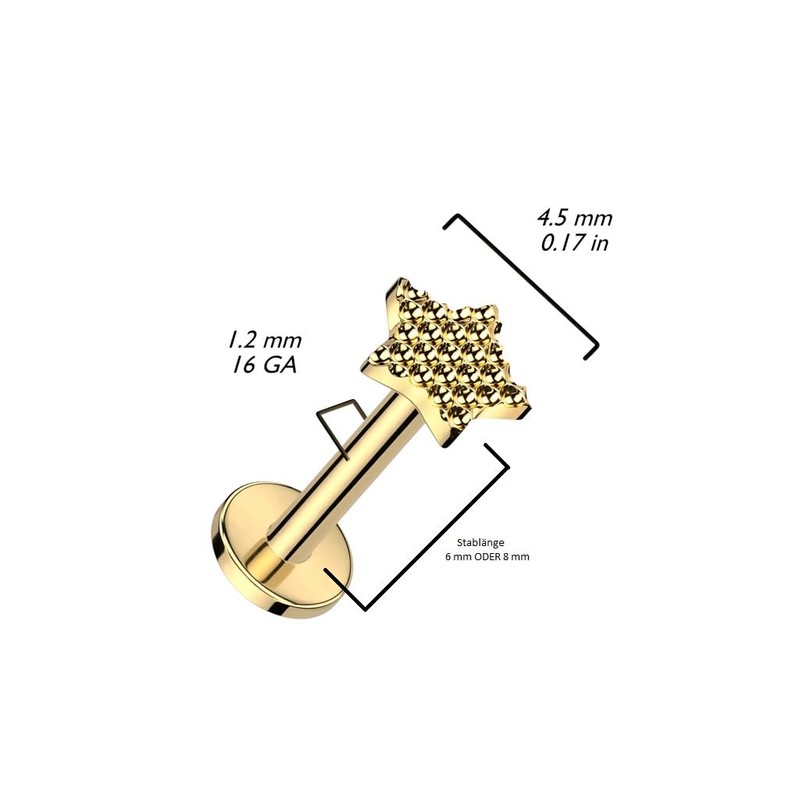 Paula & Fritz® Labret Piercing Star Titanium IUM Grade 23 Set Multicoloured 1.2 mm Bar Thickness Internal Thread 4 mm Base Madonna Medusa Ear Piercing Tragus, Titanium, No gemstone