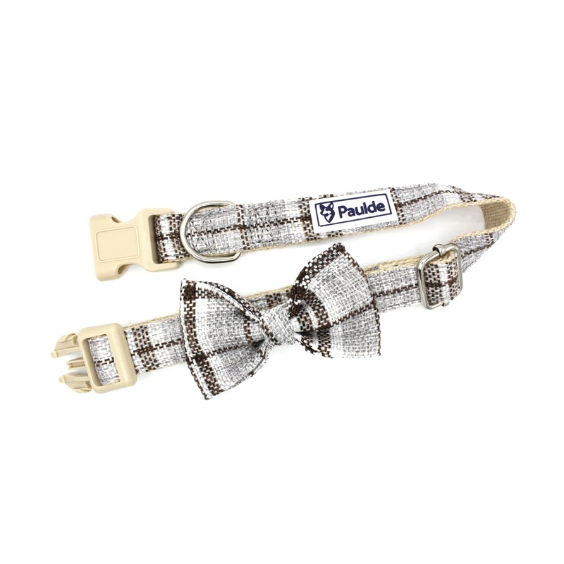 Paulde Dog Collar & Lead Set with Bow Tie, Stylish Design for Everyday and Festive Occasions, Lightweight and Breathable (Grey Chequered, L (Collar: 40-60 cm, Leash: 150 cm))