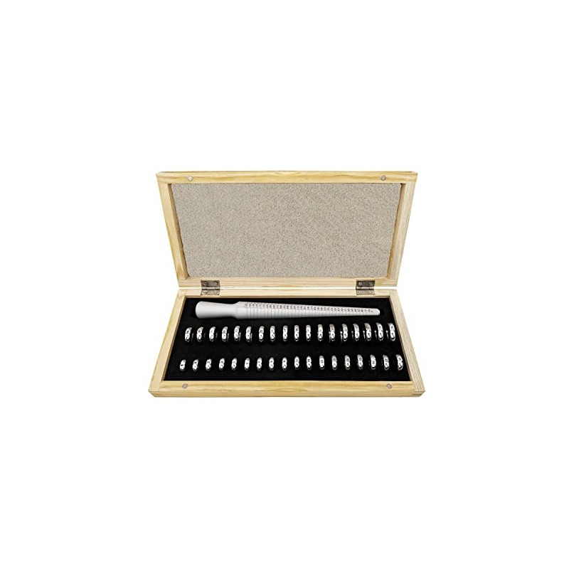 This ring sizer set consists of 36 rings and a ring stock. The rings flat on the inside are made of polished stainless steel. The respective ring size (1 to 36) is easily readable. Made of matt aluminium, the ring stock has two stone grooves. In the stone grooves are the French and American measurement chart. The size and circumference of the ring are shown in the French measurement chart. The American measurement chart shows the ring size and ring diameter. For safe and proper storage, this set comes in a wooden box with foam insert.