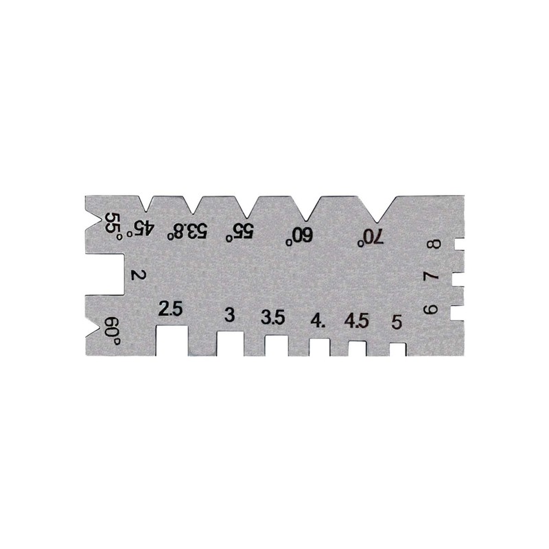 This threaded steel gauge is made of stainless steel. The surfaces are sanded. Threaded steels for flat threads with a pitch of 2 to 8 gears per 1 inch as well as for pointed threads from 45° to 70°. The standard 55° and 60° angles can also be checked with this gauge.