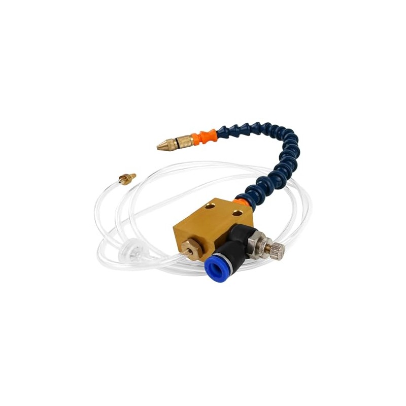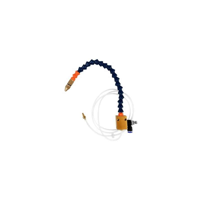 This minimum quantity lubrication consists of a brass valve block with adjustment screw, a segment hose with adjustable spray nozzle, an intake hose with intake filter and a compressed air connection for air hoses. There are two holes on the valve block, which allow a firm installation on the machine.