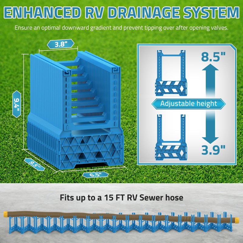 - 【Stable & Secure Fit】The widened bottom structure and deep U-design hugs the sewer hose to prevent it from falling. And this RV accessories support kit includes 4 secure rubber band straps to fix the sewer hose, providing added security during waste disposal and eliminating worries about leaks or movement.