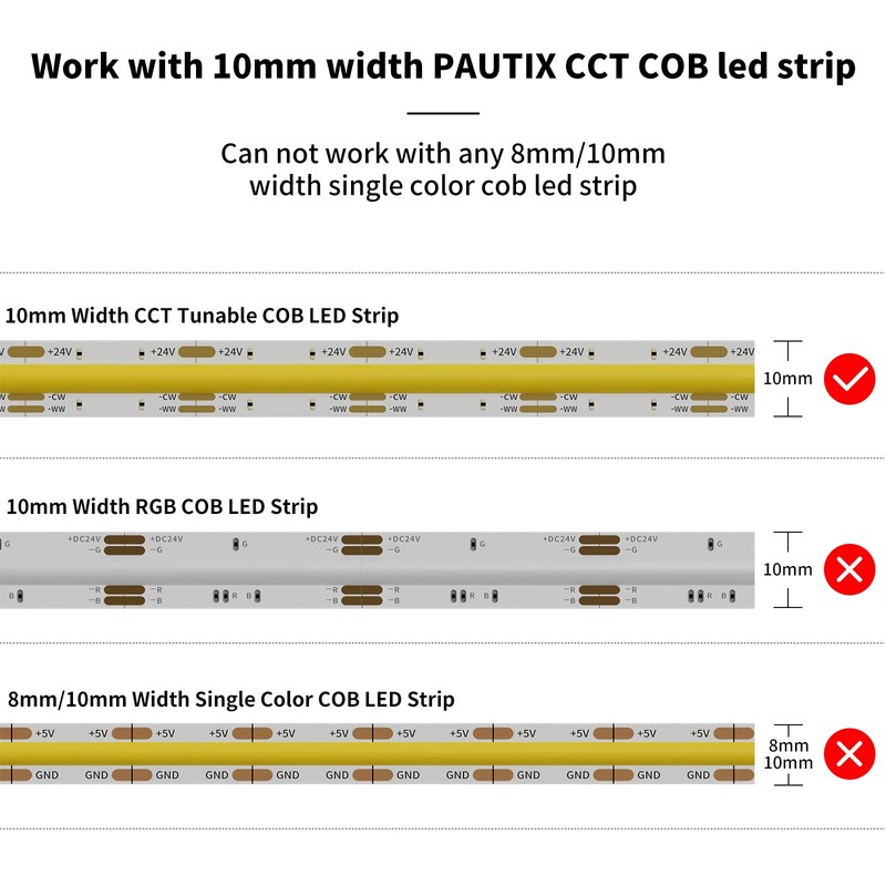 - 【Compatible Lights】This installation accessories set is ONLY compatible with 10mm width 3-pin CCT COB LED Strip lights(Not applicable to 8mm/5mm board width and RGB COB LED Strip Lights).The transparent middle connector will not block the light.ONLY compatible with 10mm 3-pin PAUTIX CCT COB strip lights, other sizes are not applicable