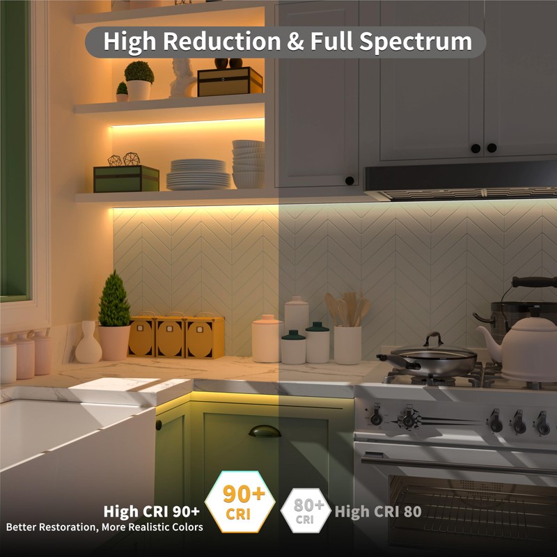 - STANDARD KIT: Each light kit comes with a 16.4ft bright warm white DC24V self-adhesive COB strip light roll, a power adapter(24V/2A),a 17-Key RF Remote and a 3-Button control box for dimming
