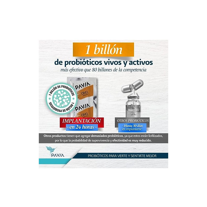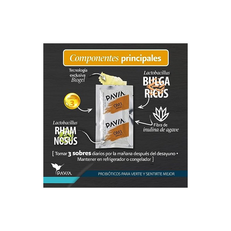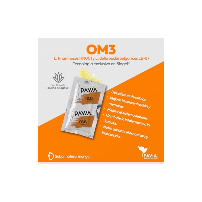 PAVIA Probiticos vivos con Omega 3Prebiticos y AntioxidantesAyuda a mejorar la concentracinSin azcarSabor Mango 1 billn de probiticos Mejora la...