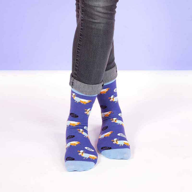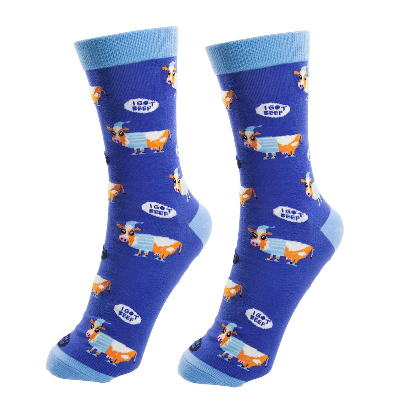 - In-house design: "move b*tch" Text is sewn into the base of the socks and is accompanied by a cow pattern with "wicking got beef" Text.