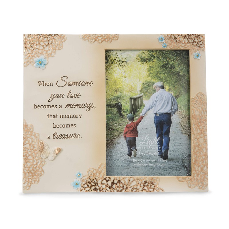 - IN-HOUSE DESIGN: "When Someone You Love Becomes A Memory, That Memory Becomes A Treasure." text and accompanying floral icons are debossed and painted around the replaceable photo.