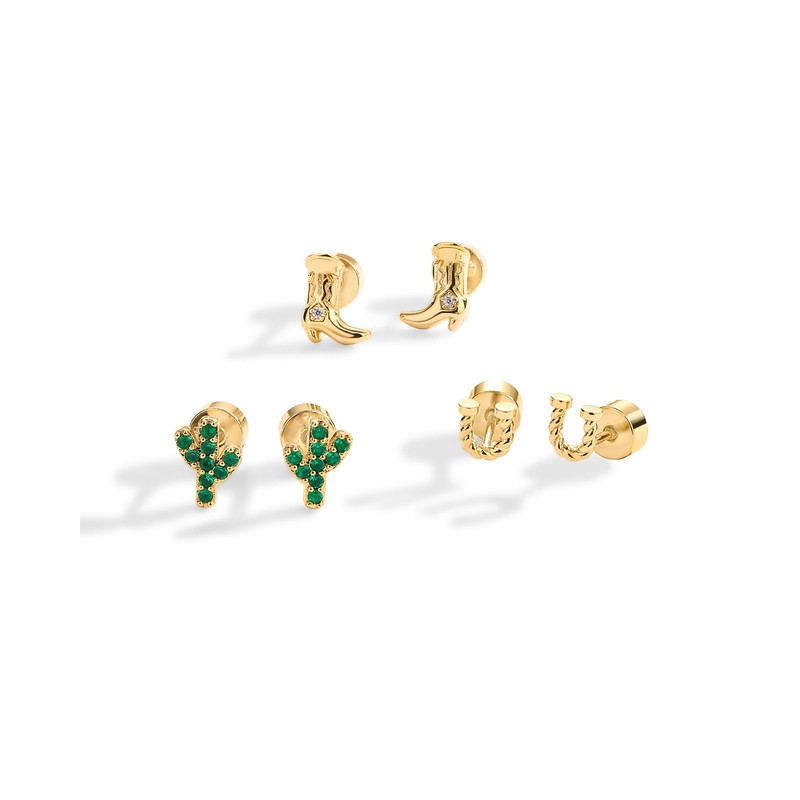 - This 14K yellow gold plated, western-themed flatback stud pack earring features an 8.2mm x 6.6mm cowgirl boots, 7.5mm x 5.5mm cactus with premium 1.2mm green cubic zirconia stones, and 5.3mm x 5.2mm twisted rope horseshoe.