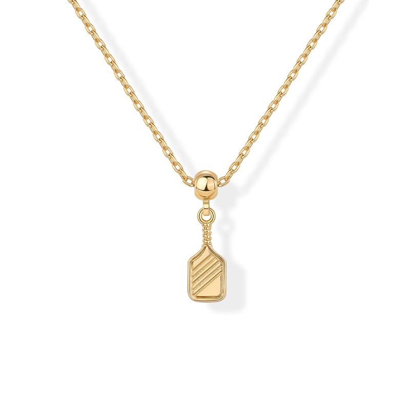 - (Pickle)ball is life, and this paddle pendant necklace proves it. Show off your love for the game in this 18" adjustable chain featuring a 10.7mm x 5.2mm pickleball charm, all plated in 14K yellow gold. This sports charm is removable, allowing you to stack it with other charms or wear it on different chains for customizable styling.