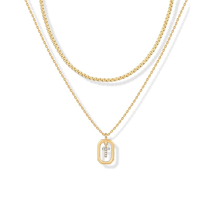 PAVOI 14K Yellow Gold Plated Cubic Zirconia Letter Pendant Layered Necklace | Framed Initial Letter Cable Singapore Chains Layering Necklaces for Women | T Initial
