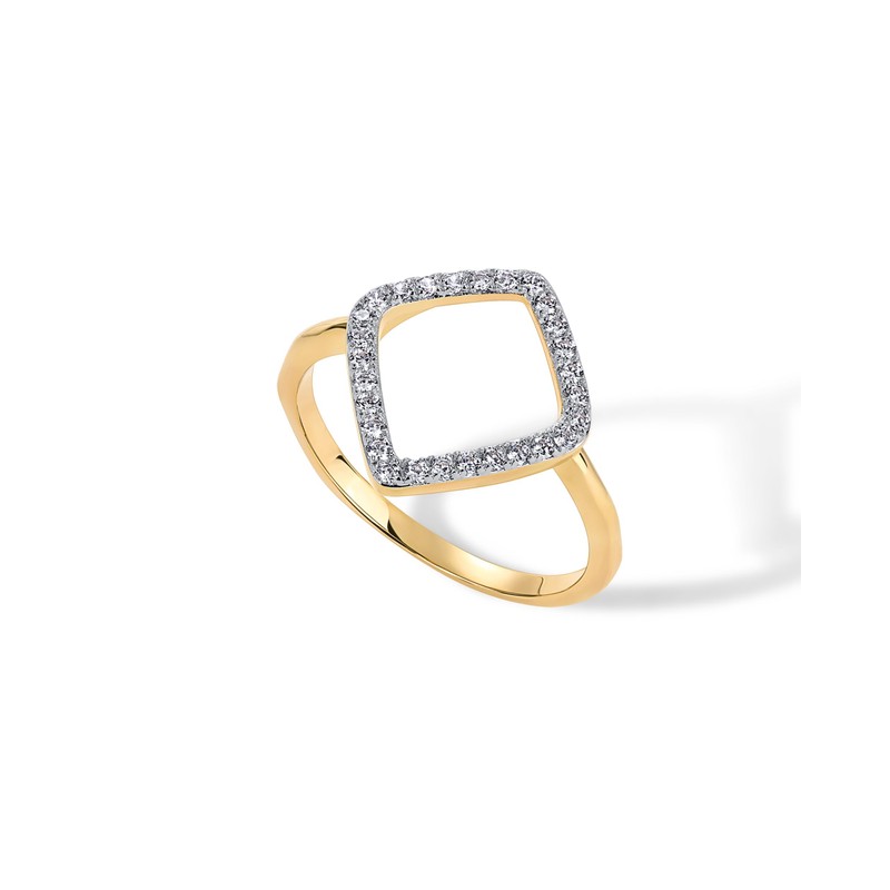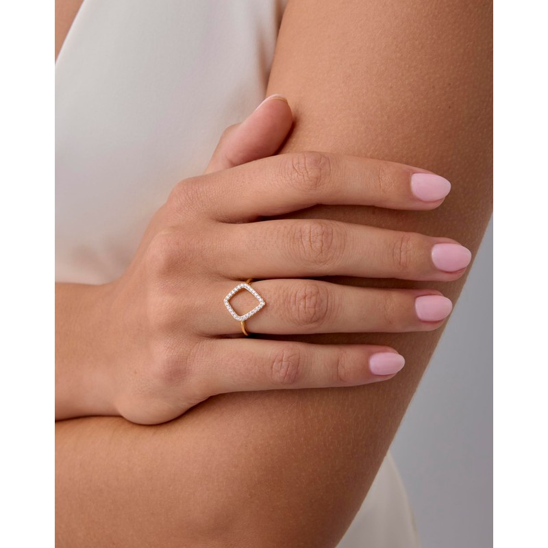 • This 14K yellow gold plated and rhodium plated kite-shaped ring has a 1.6mm wide band and features a 15mm x 13mm diamond-shaped design with 1.2mm premium cubic zirconia stones.