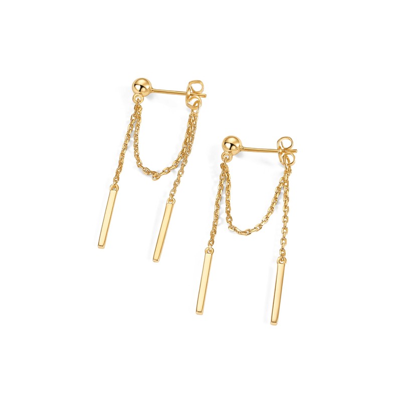- Step up your everyday style with these trendy 18k gold-plated chain drop earrings. Whether you're rocking a casual tee or dressing up for a night out, these earrings add just the right touch of flair. With a 23mm long back chain, and a cute 20mm long front chain, they're fun and stylish without trying too hard. The 13mm bar and 4mm ball stud keep things simple yet trendy.