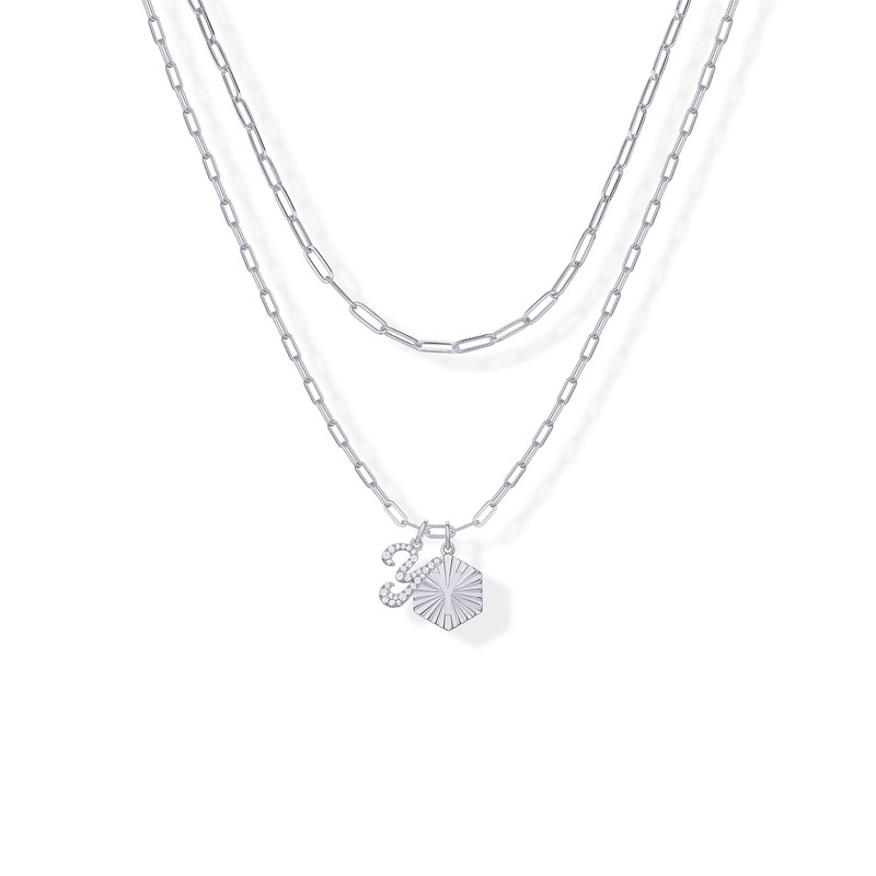 - Keep your initials close with this rhodium-plated layered pendant necklace featuring multiple lengths. The shorter paperclip chain measures 16" in length and 3mm in width, while the longer pendant paperclip chain is 19" long and 2.5mm wide. The hexagon pendant measures 15mm x 13mm, and the initial letter pendant is 12mm long.