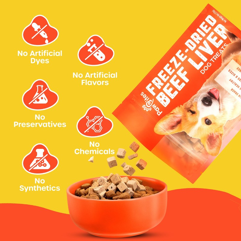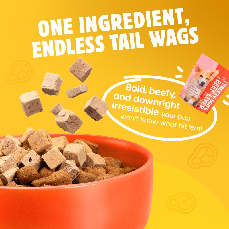 - FREEZE DRIED BEEF LIVER DOG TREATS - Actual beef liver? You bet! Our Freeze-Dried Beef Liver is a premium, meat-based treat made from 100% beef liver. Nothing else. On the hunt for dog treats large breeds and not-so-large ones are sure to drool over? Here’s the ultimate guilt-free indulgence that’s soon to be your furry buddy’s favorite. We know so—our very own Official Taste-Tester, Leo, says so