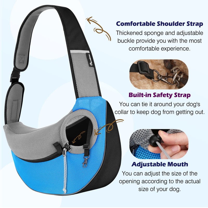 - Safety: Made of oxford cloth and air mesh, this pet sling carrier is stretchy and provides cushioning protection for your pet. The drawstring prevents the dog from accidentally opening the zipper, while also preventing him from chewing the sling bag. Built-in safety collar hook, you can buckle it to the dog's collar or harness to prevent it from falling off.
