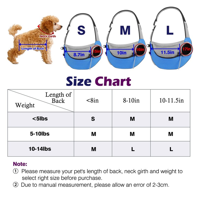 - Multi-size and Wide Application: Our dog crossbody satchels are available in three sizes and in a variety of colors. Please measure your pet's length of back, neck girth and weight according to the size chart in the third picture to choose the right size before purchase. The hand-free design make it perfect for everyday use such as shopping, biking, traveling and mountain climbing. Let your dog be by your side at all times!