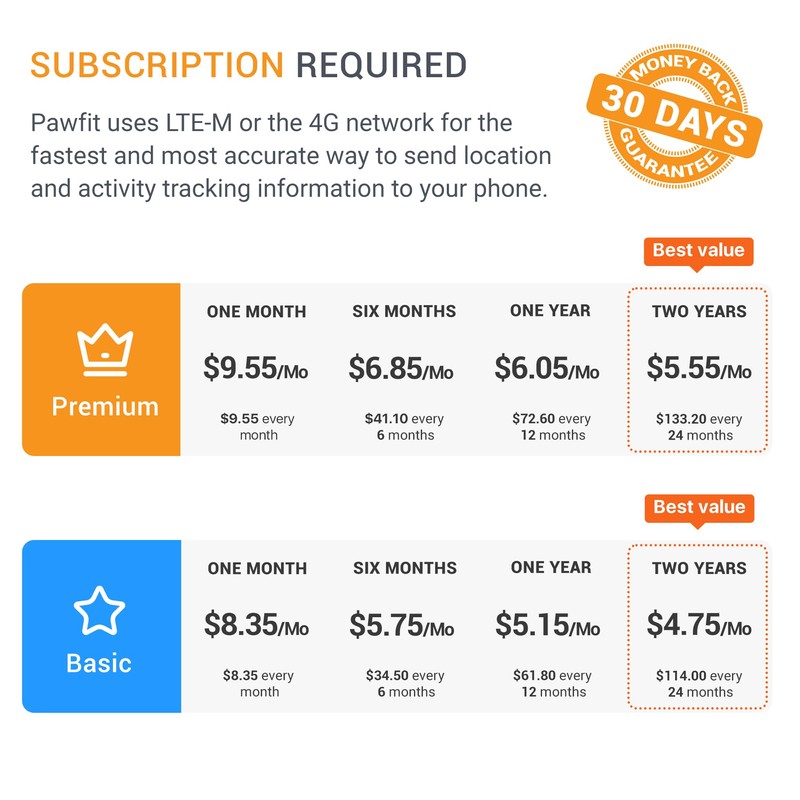 - [All-Inclusive Subscription Plans] Starting at $4.75/month, Pawfit includes all features without extra or roaming fees. Choose from 1 to 24-month options with a 30-day money-back guarantee.