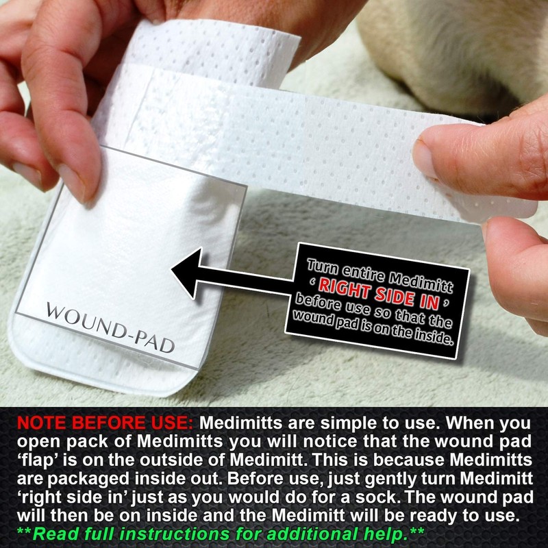- SPECIAL NOTE FOR USE: PawFlex Medimitt paw Bandages are packaged inside out. For use, gently turn right side in so that the attached wound pad is on the inside. Direct the paw into the Medimitt and wrap non- slip ADJUSTABLE STRAP around pets’ wrist. Never wrap fastening strap too tight. The Medimitt will stay on with gently stretch.