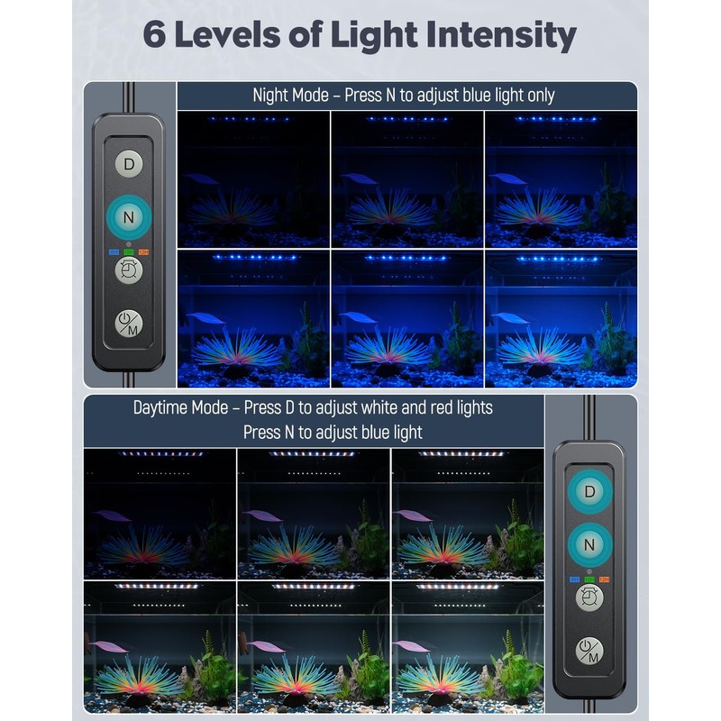 - 2 Lighting Modes: Short press the M button repeatedly on the fish tank light to switch between daytime and night modes. Hold the M button for 3 seconds to turn all lights off. Simulate natural sunrise and sunset to energize your fish and give them a sound sleep.