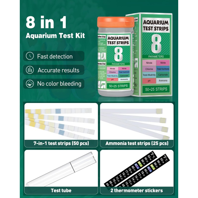 - 8 in 1 Aquarium Test Kit: Include 7-in-1 test strips and ammonia test strips. The former effectively detects 7 parameters – pH, Chlorine, Nitrate, Nitrite, Carbonate, Hardness and Total Alkalinity. The latter offers real-time ammonia tests. And the extra thermometer stickers help you detect water temp anytime