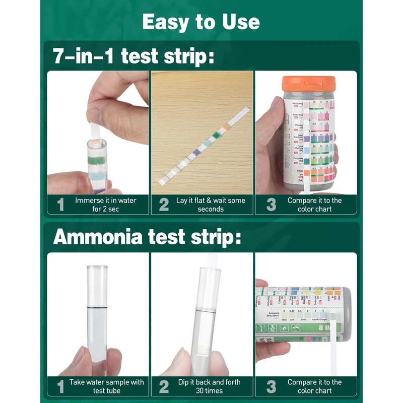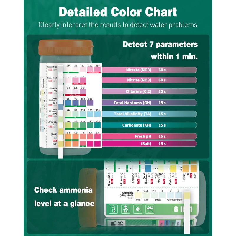 - Easy to Use: For a 7-in-1 test strip, immerse it in the water for 2 sec, take it out and lay it flat. Then wait for 15 sec for results of pH, Cl2, KH, GH and TAL, and 60 sec for results of NO2 and NO3. For an ammonia test strip, dip its tip back and forth in the water 30 times (1 second each time)