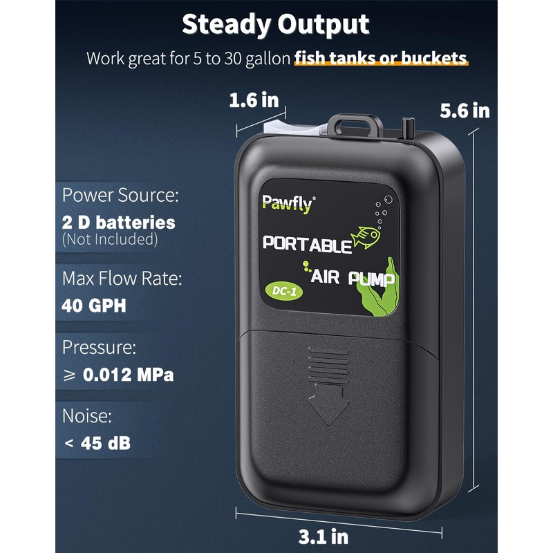 Pawfly Aquarium Battery Air Pump 40 GPH Battery Powered Oxygen Pump for 5 to 30 Gallon Fish Tank Bucket Portable Aerator Pump for Outdoor Fishing and Fish Transportation (2 D Battery Not Included)
