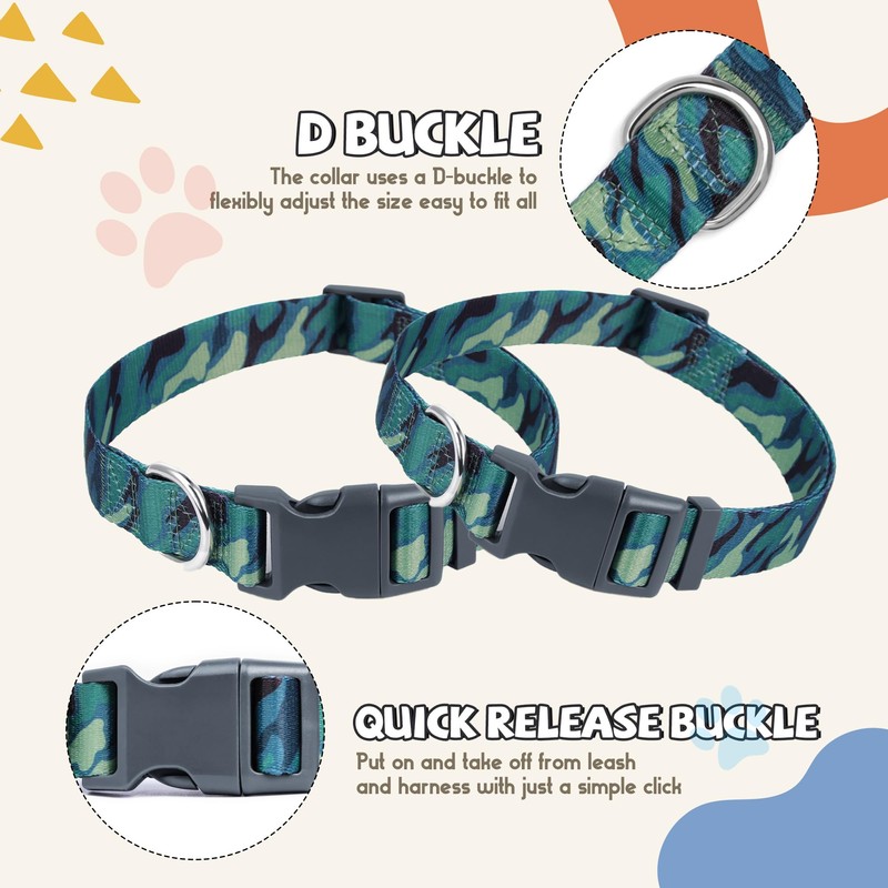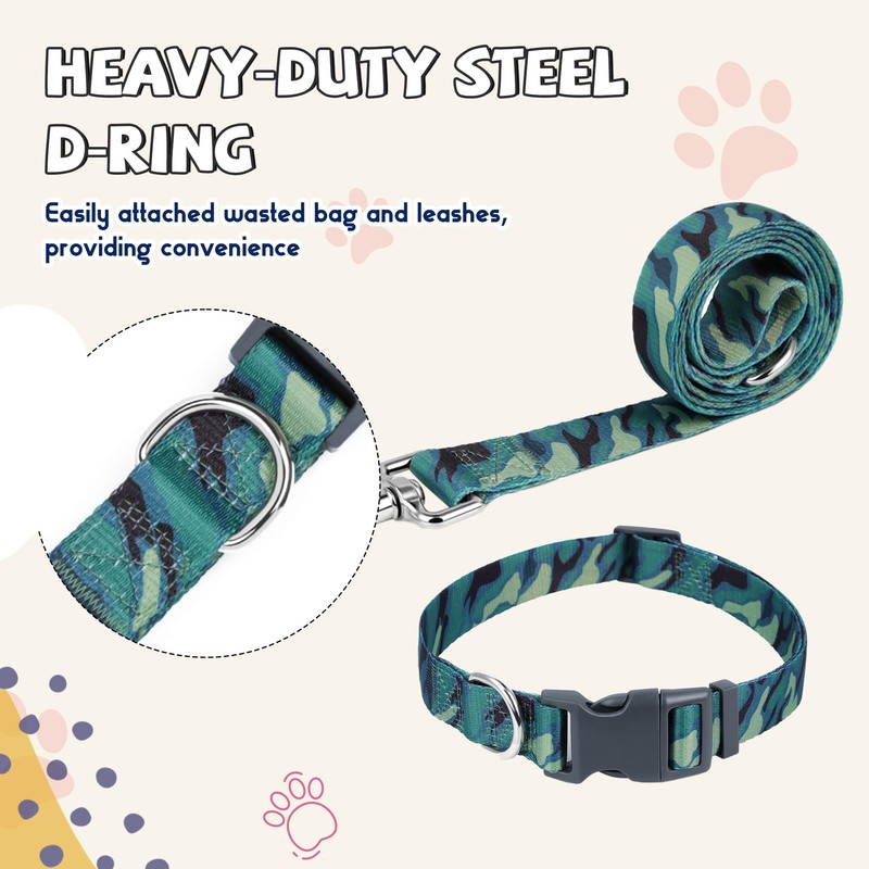 Pawhuggies Transfer Printing Dog Collar and Leash Set, 4 FT/5 FT Polyester Adjustable Dog Collar with Quick Release Buckle Heavy-Duty D-Ring, Strong Zinc Alloy 360° Clasp Dog Leash, Green Camo,M