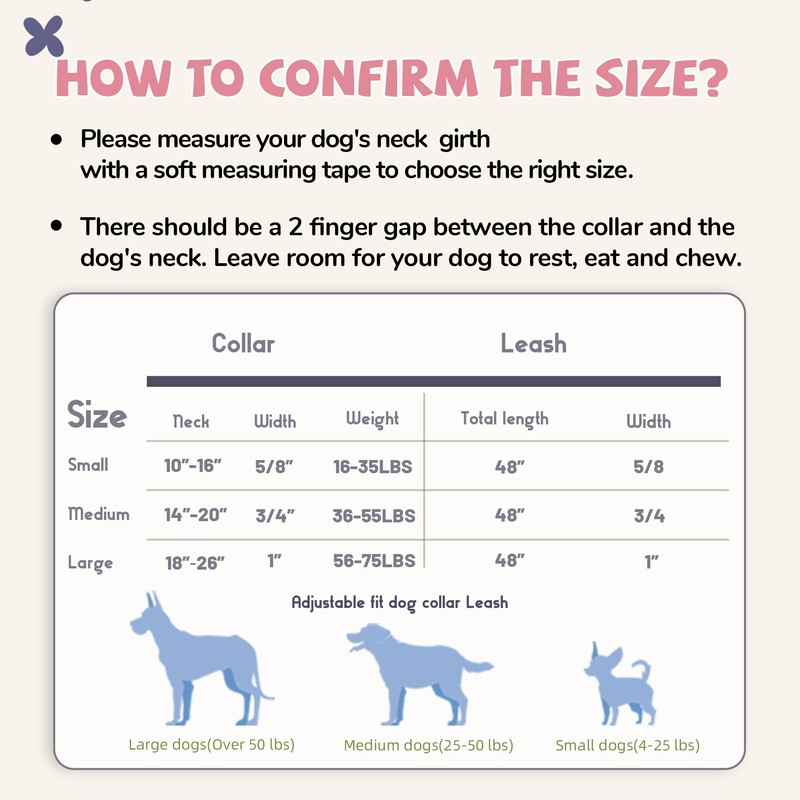 - Adjustable Fit: Embrace the versatility of Pawhuggies' adjustable collar and leash set, designed to fit dogs of all shapes and sizes. Adjustable slide buckle allows for a personalized fit, ensuring comfort and a perfect match as your dog grows. This adaptable design not only accommodates your pet's different activities needs but promises to be a loyal companion throughout their growth journey. Choose our transfer printing collar and leash set, which grows with your pet