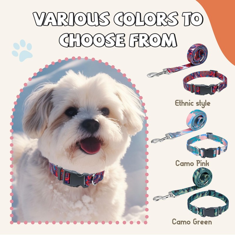 - Heat Transfer Technology: This collar and leash set's unique print patterns, crafted using advanced heat transfer technology. This innovative method blended vibrant colors and intricate designs, not only eye-catching but also long-lasting. Heat transfer process infuses the colors deeply into the fabric, resulting in a product that retains its fresh appearance wash after wash. Exclusive patterns offer distinctive style, making your pet's accessory a true reflection of their personality