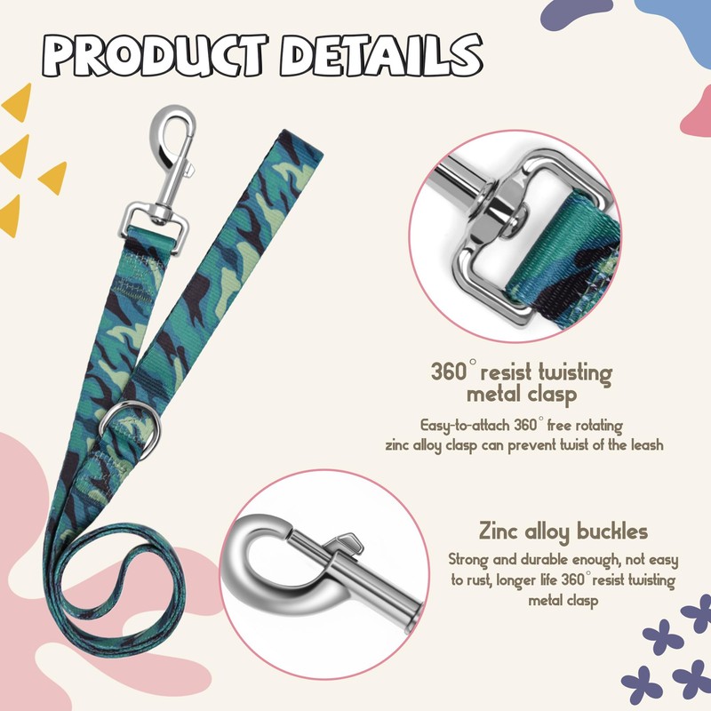 - Intimate Detail Design: Unlock effortless pet care with our collar leash set. Say goodbye to fumbling traditional clasps, our intuitive quick-release buckle design ensures swift, secure attachment. Durable steel D-ring stands up to the most playful pets, providing reliable traction during walks, also easily attached to waste bags and leashes, travels light and reduces the burden. 360° rotating zinc clasp eliminates leash tangles, our collar leash set allows your dog to roam and play at leisure