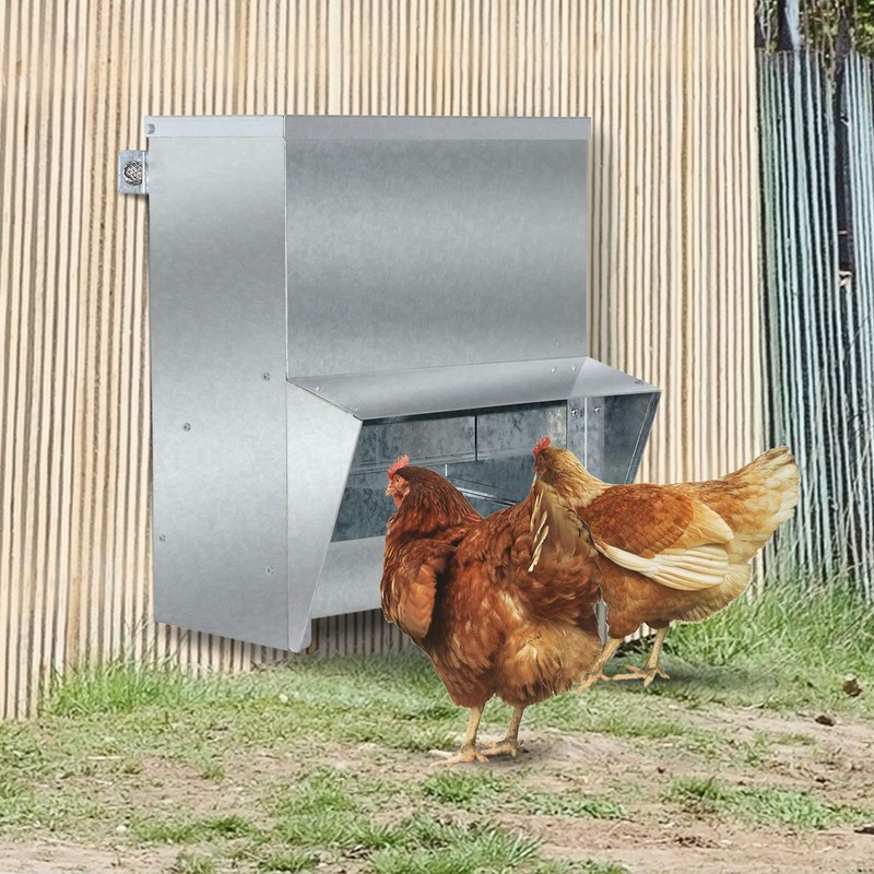 - BUILT TO LAST: Built with high quality galvanized steel finish and protective lid made this chicken feeder tough lasting in outdoor weather no matter if it's scorching sun, a light rainstorm or snowfall. A small ceiling above feed outlet keeps the feed clean and dry even on rainy days.