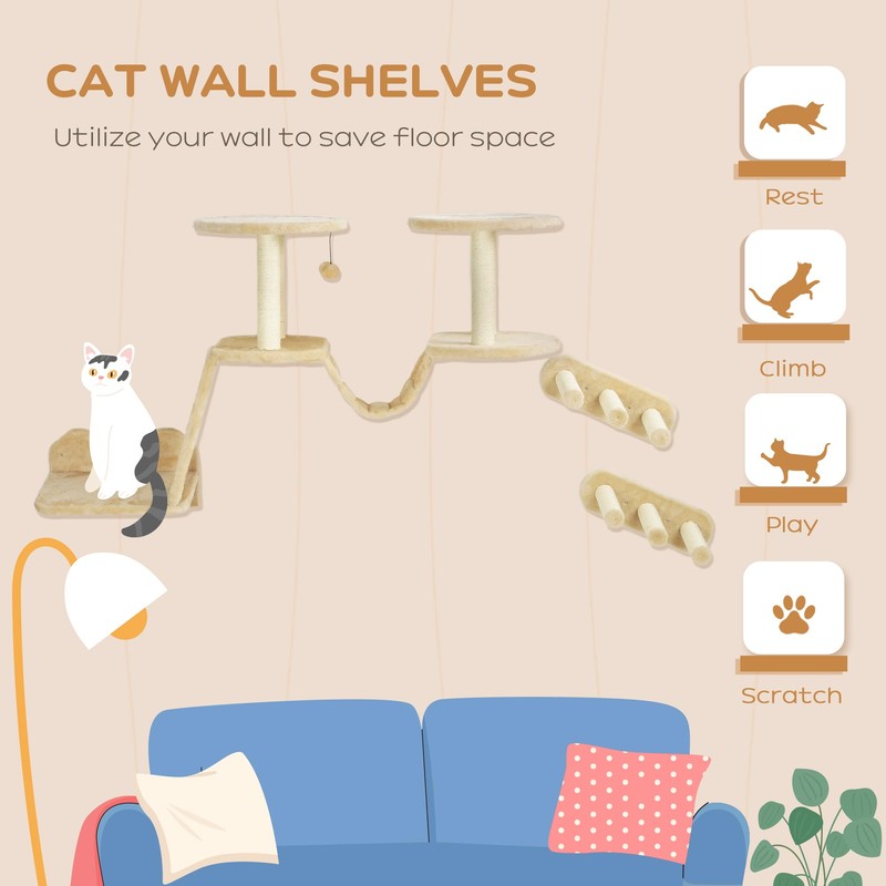 PawHut Cat Wall Shelves, 3PCs Cat Wall Funiture with Scratching Post, Perches, Ladder, Steps, Scratching Board, Ceiling Wall Mounted Cat Shelves for Indoor Cats, Kitten, Beige