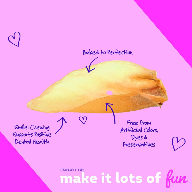 Welcome HomeRelax. Unwind. Indulge. PawLove treats and chews are here to help you show your best friend how much you love them. PawLove was founded from a desire to spoil our furry companions with delicious treats and chews C without indulging our wallets. Our dogs are our best friends, and they inspire us to spread the love with the treats and chews dogs wag their tails for.Delicious and SatisfyingAs pet parents ourselves, we wanted to create absolutely mouth-watering treats for our favorite companions in the world, without any artificial preservatives, flavors, or colors. We treat our pets as we would treat ourselves, with only the greatest and tastiest treats.For Every Good DogWe know that pet parents love to spoil their very good boys and girls, but safety is a key ingredient of love. Our products are hand-selected for optimum tastiness and optimum quality. Our goal is to have every dog enjoy a truly delicious and safe treat made with the best ingredient: Love.Spread the LoveThey'll be chewing these until the cows come home! PawLove Cow Ears are a natural alternative to rawhide that is packed with delicious beef flavor. These medium-strength chews are perfect for every dog, whether they're a hobby chewer or a serious chewer they're guaranteed to love our Cow Ears!