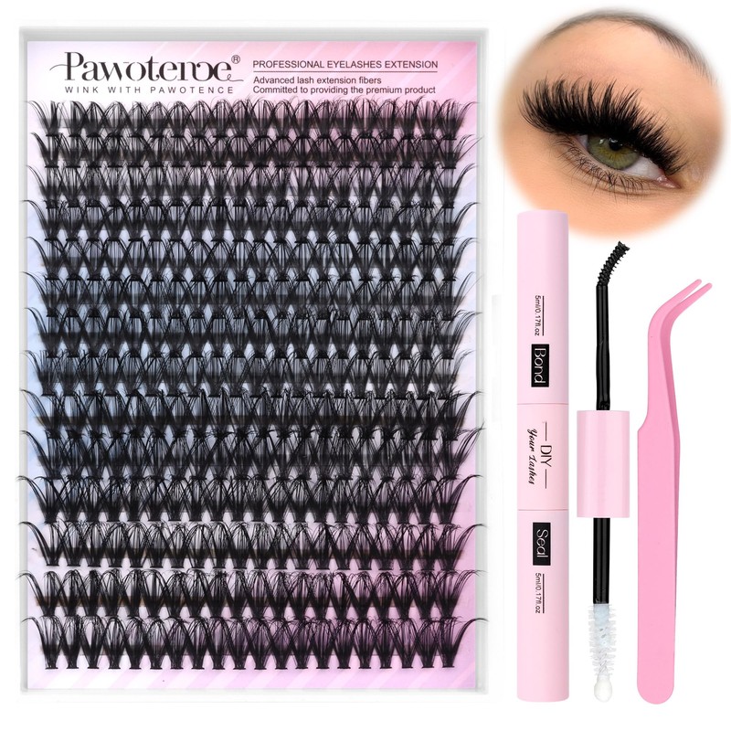 Pawotence Lash Extension Kit DIY 40D 12-18mm Individual Lashes Clusters Kit 280pcs Cluster Eyelash Extensions Kit with Lash Bond and Seal, Tweezers for Self Application (Long 40D, 12-18mm, Kit)