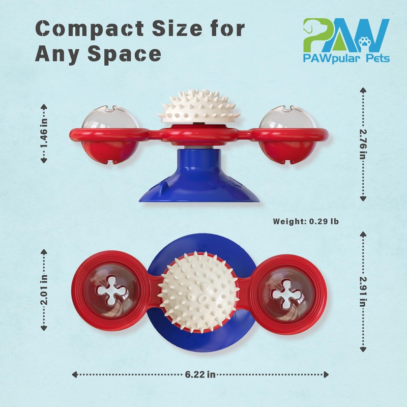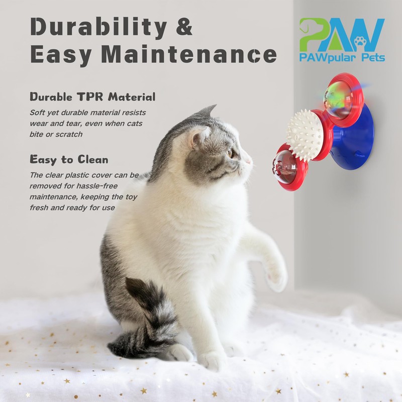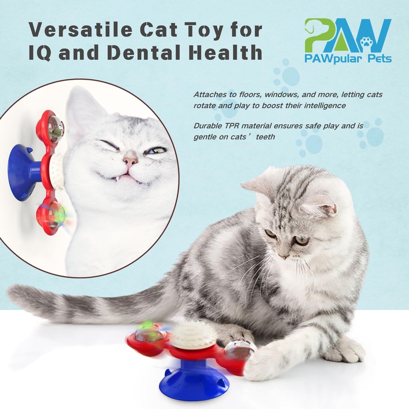 PAWpular Pets Interactive Windmill Cat Toy with Suction Cup, Rotating Catnip & Light-Up Ball for Indoor Cats, Promotes Dental Health, Mental Stimulation, and Kitten Enrichment (Red & Blue)