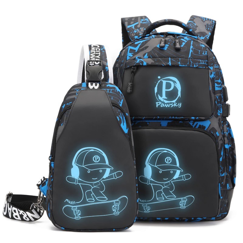 Pawsky Skateboard Anime Luminous Backpack School Backpack with USB Charging Port for Teen Boys, College School Bookbag Lightweight Laptop Bag with Sling Bag Set, Blue