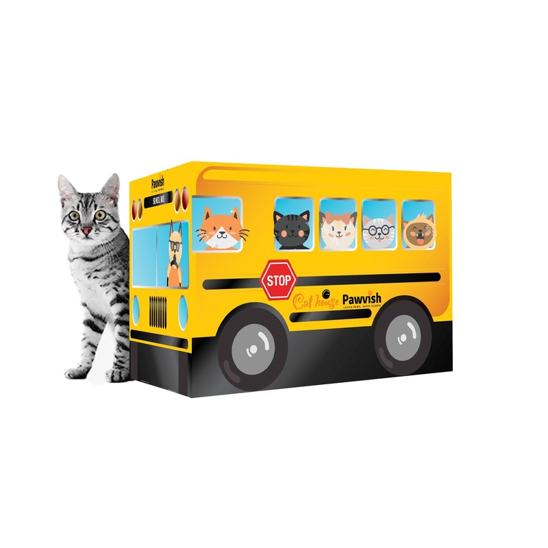 PAWVISH School Bus Cardboard Cat House and Scratcher, Play House, Scratching Pad, Corrugated Hideaway Cave, Cute Kitty Condos Box, Bed for Indoor Cats, Kittens, Bunny, Fur Babies