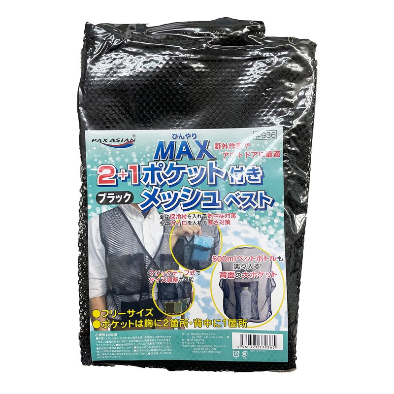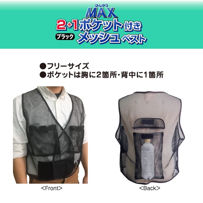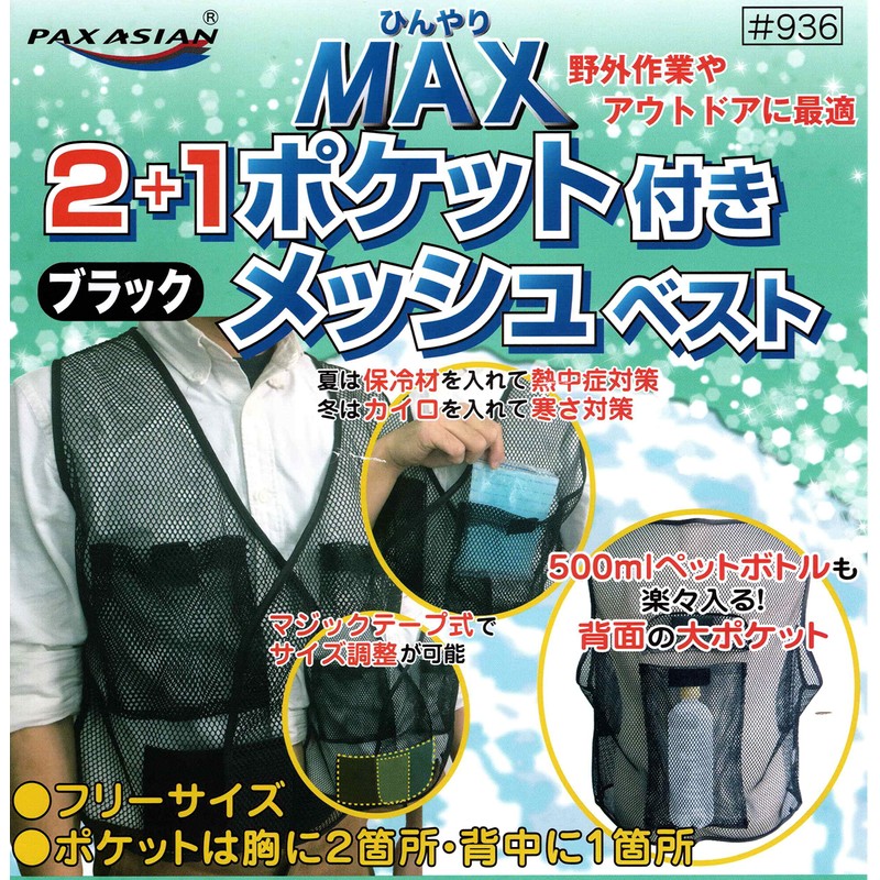 PAX-ASIAN #936 Cool MAX Unisex Thermal Protection Mesh Vest, Cooling Sensation, 2+1 Ice Pack Storage Pockets, Can Store Plastic Bottles (Coolant Not Included) Black, Black