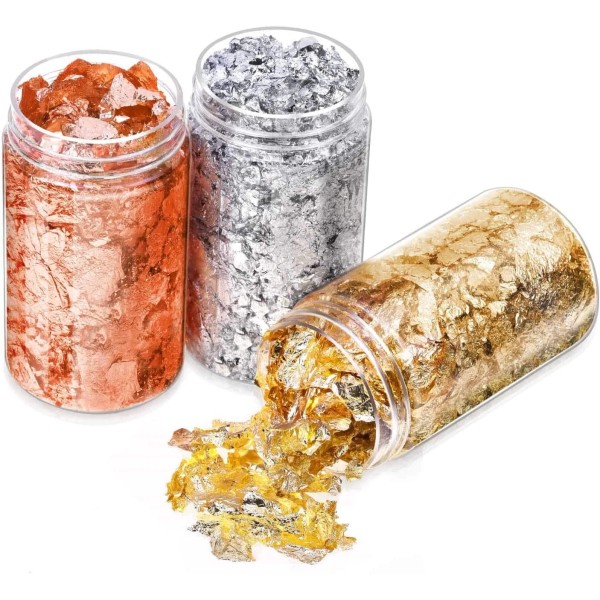 Product Features: Sizes: available in 3 different sizes: - 3 grams per color, totally 9 grams - 5 grams per color, totally 15 grams - 15 grams per color, totally 45 grams Colors: Gold, silver and copper Applications: Suitable for resin crafts, gilded statues, paintings, ceramics, manicure, polymer clay, walls, gilding crafting, decoration, furniture, picture frames, interior design and artistic work Product Included: - 1 bottle of gold foil flakes - 1 bottle of silver foil flakes - 1 bottle of copper foil flakes
