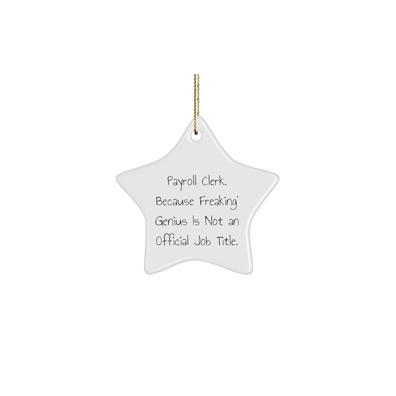 - Show off your appreciation for a payroll clerk's hard work and dedication with this unique Star Ornament, designed to make a statement. This quote 'Payroll Clerk. Because Freaking' genius Is Not An Official Job Title.' is a bold statement that shows you're proud of their work, and this ornament is the perfect way to express that.