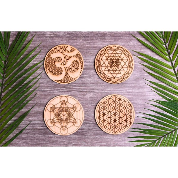This coaster set has one each of the Metatron’s Cube, Sacred Om, Sri Yantra, and Flower Of Life symbols (also available as single pieces of art on this site) sized at 4" across to fit under your favorite beverage.
