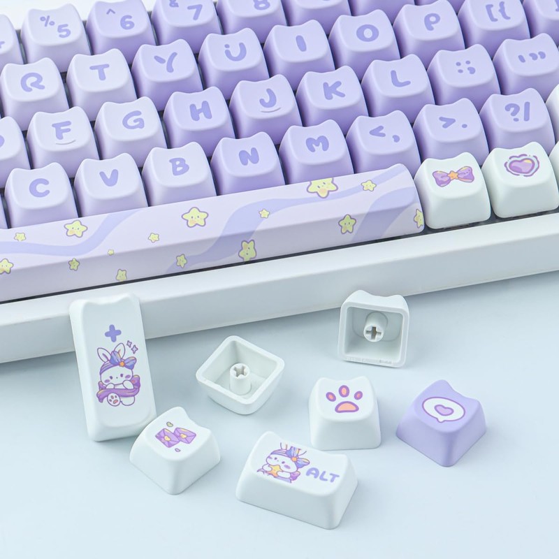 - PBT Keycaps: These purple bunny keycaps are made of PBT material, with a matte texture and anti-grease coating. These keycaps are resistant to wear and tear, thick and durable, fine workmanship, and not easy to get dirty