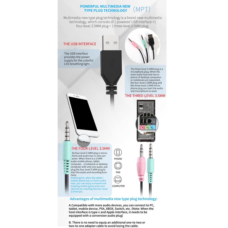 3. Wide Compatibility: Equipped with new multipurpose plugs such as double 3.5 plugs and USB plugs, compatible with a wide range of devices.