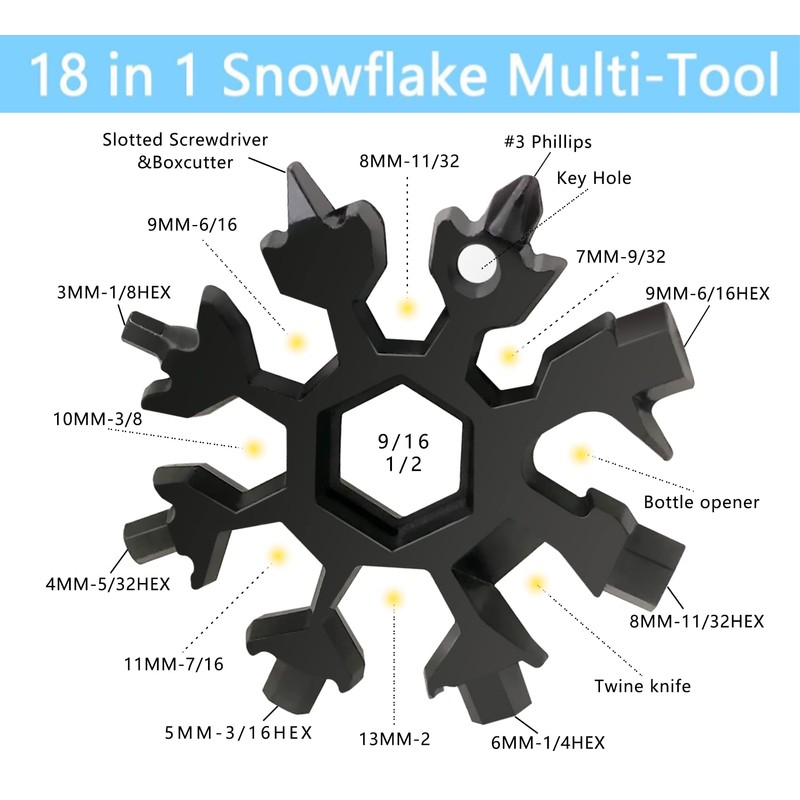 - ❄️【Snowflake Tools High-Quality Materials And Design】The 18-In-1 Snowflake Multi-Purpose Tool Is Made Of High-Quality Steel. It Has The Characteristics Of Ultra-Sturdy, Rust-Proof, Anti-Corrosion, And Excellent Hardness. This Snowflake Tool Is Durable. The Unique Snowflake-Shaped Design Allows Us To Creatively Combine The Perfect Shape Of Nature With The Functions And Design Of Our Compact Multifunctional Tools