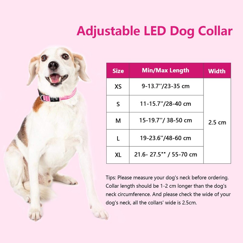 - 【Fully Adjustable Light Up Dog Collar】 XS 32-35 cm / S 35-40 cm / M 38-50 cm / L 48-60 cm / XL 55-70 cm. Easy to carry, with quick release, adjustable length. Please measure the circumference of the dog's neck with a soft tape measure to choose the right size. Always give your dog enough air to breathe.