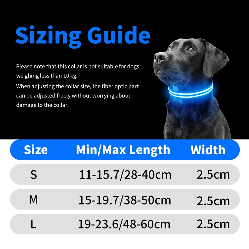 - Illuminated dog collar for small, medium and large dogs. Thanks to the adjustable size, this collar can be adjusted to pets of different breeds and sizes (over 10 kg). It ensures a comfortable fit without restricting freedom of movement.