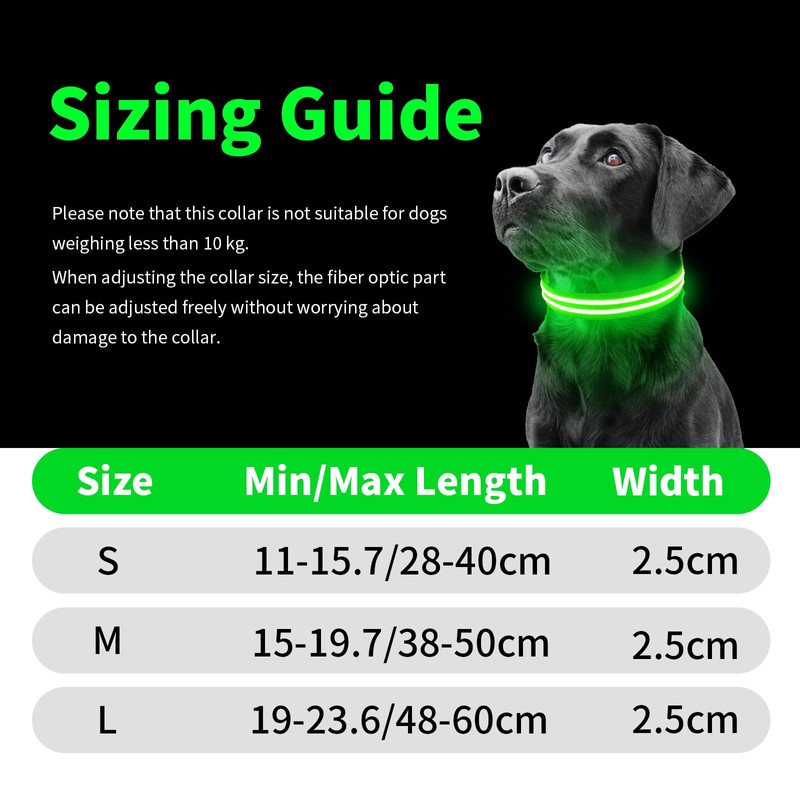 - Adjustable Light Up Dog Collars: Available in 4 sizes - S (11in-15.7in) , M (15in-19.7in) , L (19in-23.6in) , XL (21.6in-27.5in). Please measure the circumference of the dog's neck with a soft tape measure to choose the right size.