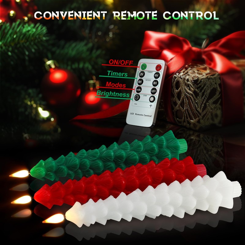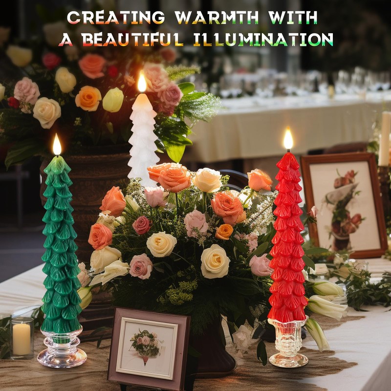 - WONDERFUL CHRISTMAS GIFT CHOICE - 【You Will Get - 3pcs Christmas Tree Shaped Taper Candle in 3 Colors (Green, Red, White) + 1pcs Remote with Button Battery.】Excellent presents to express your love and concern to your family, lover, friends, or even for yourself! Especially on Thanksgiving, Xmas, Birthdays, Housewarming and Party Hostess Gifts.
